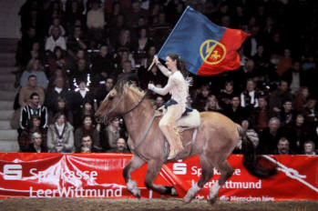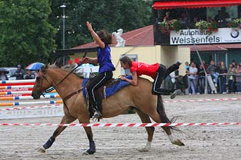 Banditas Unser Sahnestück ist das Trickreiten. Vier Cowgirls reiten im rasanten gestreckten Galopp auf-, neben-, hinterm und unterm Pferd. Sie reiten ihre Runden in der Arena und ziehen mit dem Nervenkitzel das Publikum mit in den Bann.Weitere Shows: Indian-Stuntshow - Amazonenshow